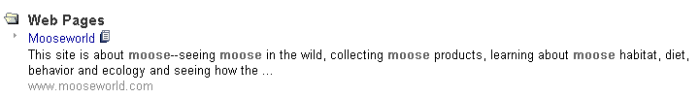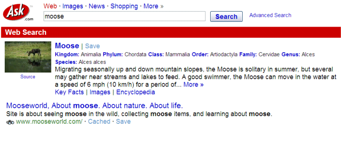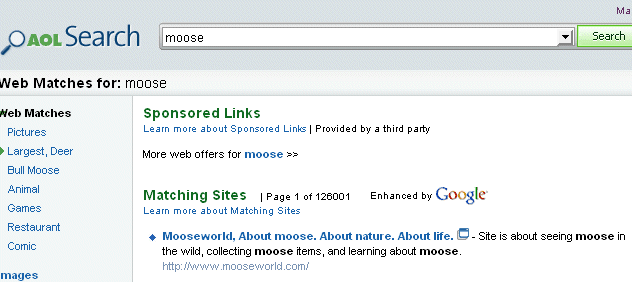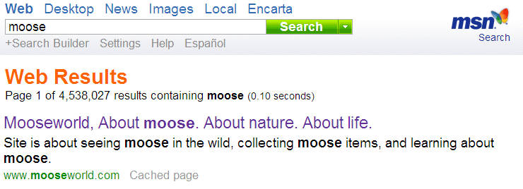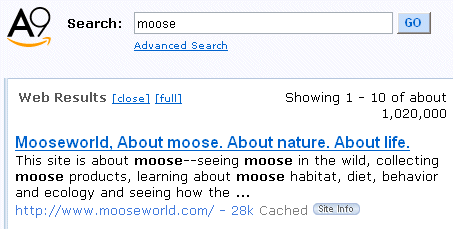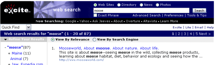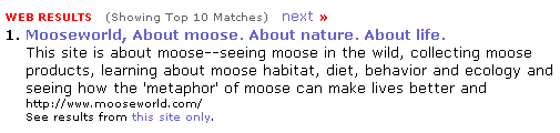 HotBot, a popular search site that is part of the Lycos Network, used "Direct Hit" results for most popular sites. The most popular site for moose was Mooseworld at #1.
