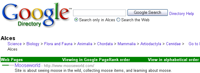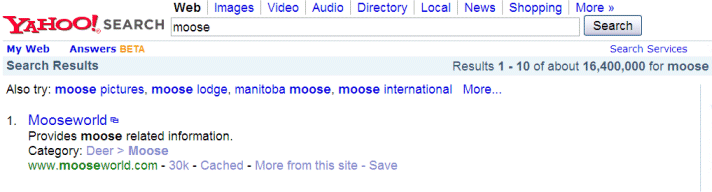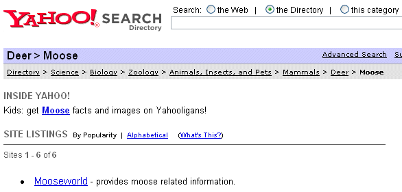 Yahoo! pioneered the Web directory. If you look for "moose" in Yahoo!'s directory, where results are given by popularity, Mooseworld is #1.