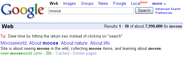 Google is the most popular seach site on the Web. If you look for "moose" in Google's directory, where their "PageRank" results are given, Mooseworld is #1.
