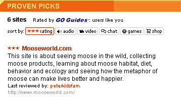 The Go.com site included the pioneering Infoseek search engine and had their own quality rating system until they changed their business model to include only paid listings. Under the former system, Mooseworld had the top three-star rating for Proven Picks and was #1.
