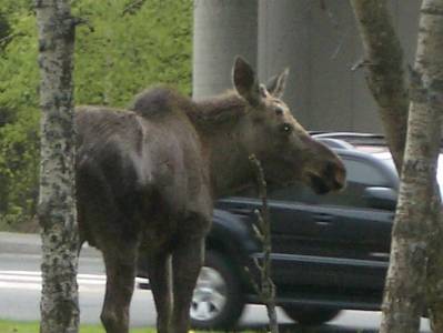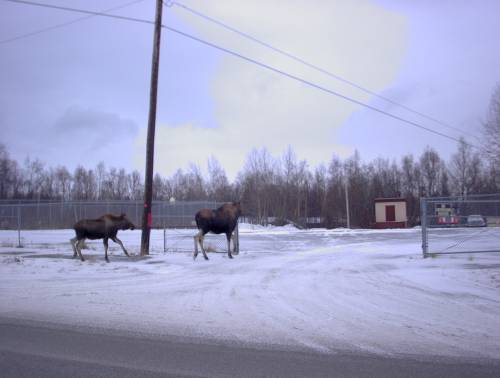 "[This moose photo was] taken at the University of Alaska, Anchorage. After all that time on campus, our moose would never understand why these students chose Seawolves as their mascot. Your fan, Sava."