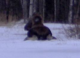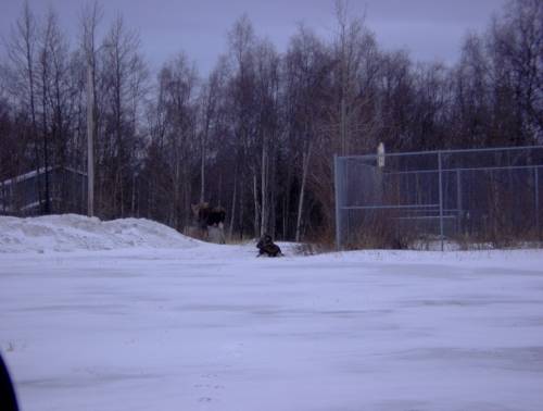 "I took these photos in south Anchorage a couple weeks back [January 2005]. The moose got spooked and started to trot off when the calf slipped and fell on the ice. He sat there a few minutes kinda scared, then mama turned an waited till he got up. Then they walked off together. Ken."
