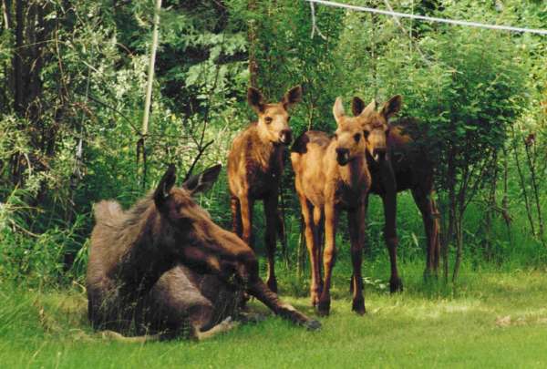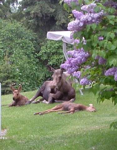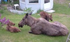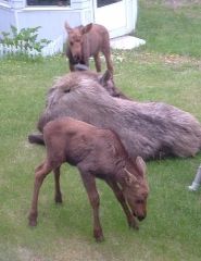 "I have some very close up photos of a mama moose and her two day old twins. They were taken from the window of my home in Achorage. Katie."
