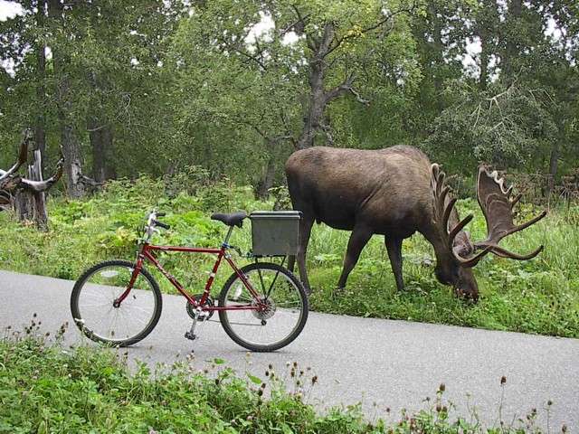 "I photographed this bull alongside the Tony Knowles Coastal Trail in Anchorage. After many attempts, and a lot of patience, I was finally able to get the bull and bike in the same frame. The bike adds some perspective on the size of these gentle, but capable, giants. Moose sightings along the Coastal Trail are commonplace; however, this bull is an outstanding specimen! Bob."