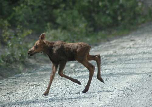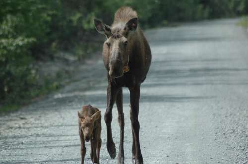 "I have a photo of a mother and calf coming down the road right at us. These photos were taken in th Kenai Animal Refuge with a Nikon D70 digital with Nikkor 70-300mm lens. Donald."