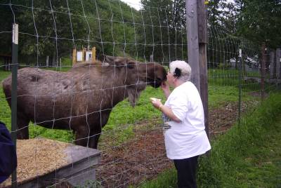 "I don't know if this picture qualifies to be shown on Mooseworld but here goes. We were in Palmer in June and went to a place called Reindeer Farms. There I met two wonderful moose, Bruce Lee and Kathy Lee. They aren't tame but are used to people. As you can see I had the grand privilege of kissing Kathy. She also ate a piece of bread out of my mouth. I was able to kiss, pet and feed Bruce too. I came home with lots and lots of moose hair, which I proudly display in a decorative glass jar. Moose are my passion. I only wish we lived in a place where we could see them more often. But, whenever I get moosesick, I open up my jar of moose hair, take a whiff, touch it, and get happy all over. Hope you enjoy the picture. It was a thrill of a lifetime. Susan."