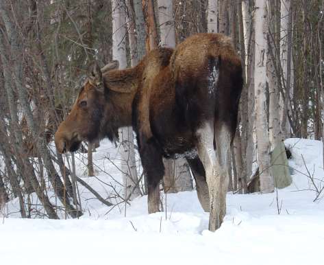 "I live in North Pole and share my yard with a second-generation female moose. When I woke up this morning she was lying in the road outside of our house and immediately I feared the worst. As it turns out she was in labour and about to give birth to a new baby. I got this picture of her before she trudged off into the brush to have her baby. Ariella."