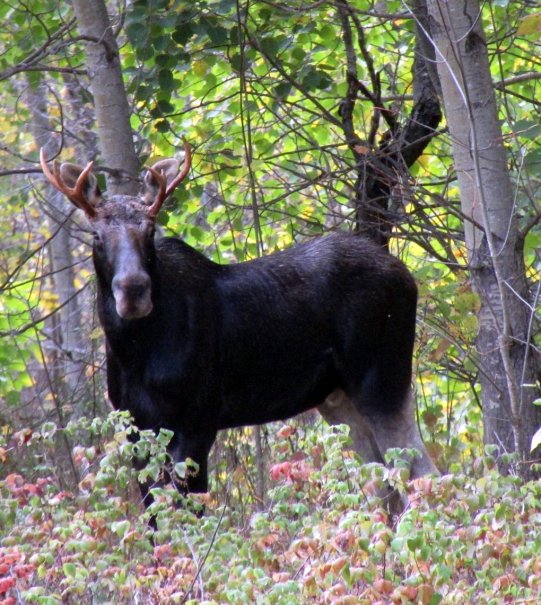 Further down the road there was a male bull wandering in the street that subsequently ran into the bush. We pulled on the side of the road again and saw two young male bulls eating vegetation in the water puddles at the ditch. On our way home we saw one more moose in the thick of the woods at the side of Highway 60. We felt it was worth it! Rachael."