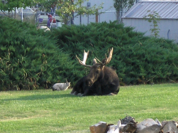 "It was a hot day in Coeur d'Alene and this bull moose wandered into our neighborhood for some apple trees, shade, and a nap with a cat! We had a Bull Moose visit our neighborhood three days ago (September, 2011). I got to watch him for 2.5 hours before going to work, and when I came home in the evening he was still there munching on all the trees! Kelly."