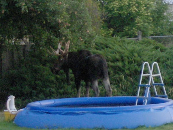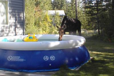 "I live in northern Idaho and this has been very hot. I had some freinds over for cold drinks and to swim in our pool. We had an un-expected guest that wanted to joint in the fun and drinks. This moose had a 1700 gallon drink. She had no problem that we were on the patio feet away... Steve."