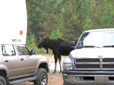 I was glad when he again decided to grace our camp in September. This time I was prepared with my digital camera. My husband and dog had just been outside so I was quite surprised to look out the window (before I went out) and see a moose looking back in at me! I whispered "moose" and grabbed my camera and snuck out the door once he began to move away from our trailer. He allowed me several good pictures before he left. Unfortunately, I did not get one of him checking out the empty Moose Drool Ale case. That would have been a fun picture! Linda."
