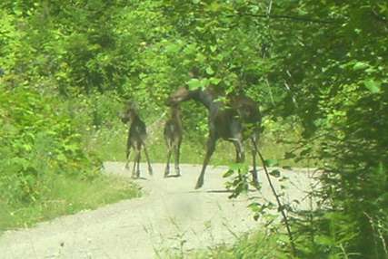 "In our quest for moose in northern Idaho, we had the chance to see something very unusual. We were driving down an old 4 wheel drive road and came around the corner to the place you'll see in the picture we've attached... a mom moose with two babies. The moose were heading down the road and ran into the woods as we approached around the corner. I just got this quick shot before they left the road and disappeared. I thought you'd like it."