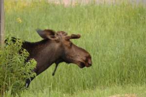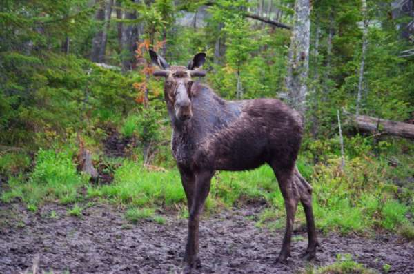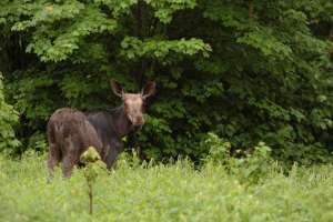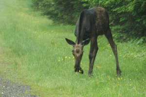"We spent the four days before Memorial Day in Errol around the Magalloway River and Lake Umbagog. In three days we saw 24 moose. Two of the sightings occurred while we were walking through the trails of the Lake Umbagog Wildlife Refuge. One bull moose walked onto the trail just ahead of us. He watched us for a moment then went about browsing the grass for about five minutes before he went on his way. It really becomes evident how large these animals are when you are alone with them a mile back in the woods. (We maintained a minimum 30 ft distance from him for obvious safety reasons).