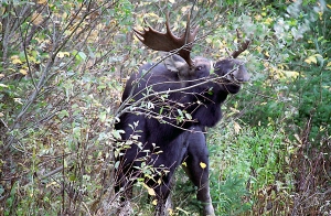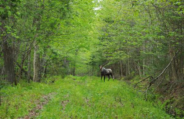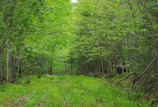 Here is a bull we encountered on Mt. Magalloway. We had just gotten back to the trailhead after hiking to the top of the mountain. The trailhead is about eight miles back along logging roads. I looked up to see the bull emerging from the woods and feeding along the edge. He was about 25 feet from us and continued to feed for about 10 minutes while we watched. He then slowly walked along the logging road and onto area of the woods making a quiet woofing noise. Great experience for us, especially being so far back into the woods.