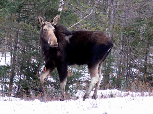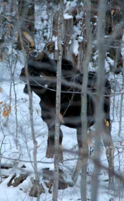 "I was browsing through the recent sightings and noticed that other than Alaska, I didn't see alot of "moose in snow" photos, so I thought you might like a sighting report and photo taken last week in Lincoln. This photo was taken in the late afternoon along Rt 112 (the Kancamagus Highway) about 3 miles east of Lincoln. She was browsing the brush in the woods. It's one of our few winter-time sightings. Elisa."