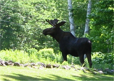 "Here is a photo in our front yard in Manchester. I was on the phone with my wife the morning of July 3, 2007 when I looked out the window and saw this very large moose walking between our garage and house. Luckily I had my camera nearby and the moose was not in a hurry. He stayed around for awhile and was nice enoughto let me take some pictures! Michael and Denise."