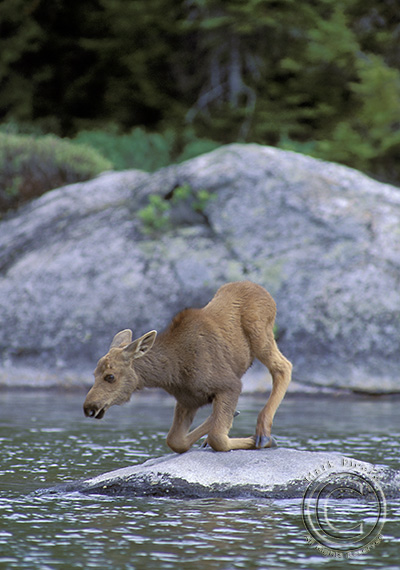 I especially enjoy photographing newborn moose calves. During the first few weeks after birth, the calves' coats are cinnamon in color and their long legs just don't seem to fit their bodies. This image shows a two week old calf struggling to bed down on a rock. I previously watched this calf swim circles around its mother while the mother grazed on grasses on the bottom of the pond.