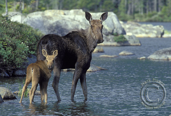 To get this photograph (the calf was very far away) I had to stack converters together on my 400MM Nikon lens, using a tripod for support. In a pinch, this practice can be done without losing too much quality. Besides, it would have taken too long to get closer - I would have missed the photo. I would have had to get to the other side of the pond and the light would have been backlit, and I didn't want that. Also, getting real close to the calf would have created another major problem - the mother moose! Moms are very protective of their offspring, and I didn't want that kind of trouble. Wildlife photography demands a deep respect for the subject. I do not want to unnaturally influence the behavior or the interaction of the animals. Ethically, I'm only a non-interfering observer recording a moment in nature. I try to avoid being a negative influence on the animals, even if it means missing the photo opportunity.