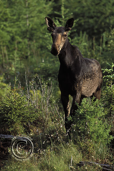 For this image I was hunkered down behind a pile of blow downs near the edge of a pond, dressed in full camo clothing while feeding the relentless black flies. The cow and her newborn calf meandered out of the woods and started to walk along the edge of the pond. I wanted to photograph the two looking over their shoulders, so I gave out a very soft moose call. They both stopped momentarily and I managed to click off a couple of frames before they lost interest and wandered off.