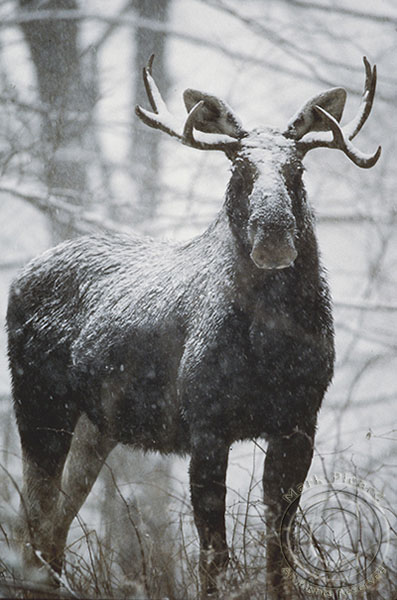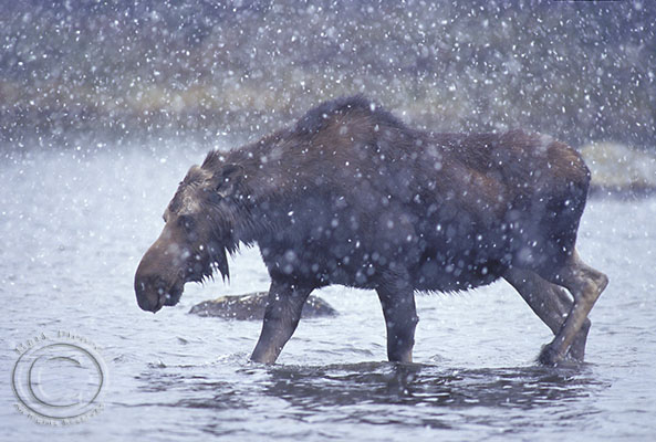 This cow moose was photographed during an early winter snow squall in Baxter State Park in Maine. The pond had not yet frozen over, so the moose could still feed on the sweet grasses covering the bottom of the pond.