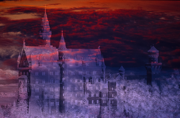 This is one of the results: A mystical approach emerging from the sunset combined as a sandwich with a black&white ngeative of the castle. Could very well be, that Dracula originally was in Neuschwanstein :-)