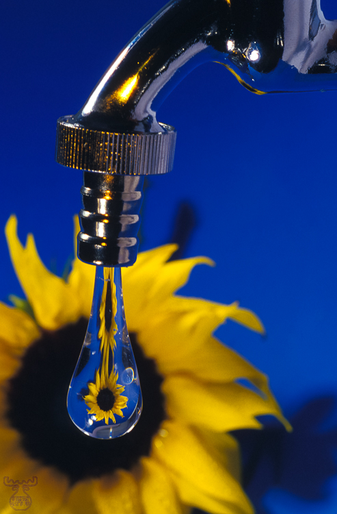 After several tries with water and glue to artifically create a big water drop, I remembered I had seen a glass drop used for decoration in a handicraft shop some time ago. Happy, that I really found such a drop after some searching this picture came into being in a studio session (Sounds proffessionell, was actually just a temporary setup in a big room) in one afternoon.