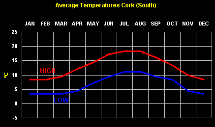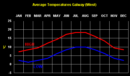 A temperate, maritime climate, supported by the North Atlantic drift (a powerful, warm current), gives mild winters and cool summers with considerable humidity. Palms are not seldomly seen, especially in the Southern parts.