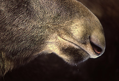 The nose is highly important for the animals, as most of moose's communication works on smell. Additionally he of course finds food and detects threats with the highly developed smell sense. The nose works both in forward as well as in reverse direction, the high quality derives from the huge total smell surface area of around 800 cm² and the high densitiy of sensory receptors - 200 times more than that of a human and still 4 times that of a dog! |