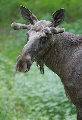antlers upright. The nose is extraordinarily complex in anatomical aspects of muscles (for the flexibility and mobility) and nerves. The muzzle is equipped with tactile hair, which the moose uses for selecting twigs and leaf. Channels in the muzzle allow swallowing below water, which is unique for deer (the exact functionality is not researched yet). On the muzzle moose have a small triangular, naked spot below the nostrils, as you can also see on the picture to the right. For information on the antlers refer to the section "Antlers & Fight" |